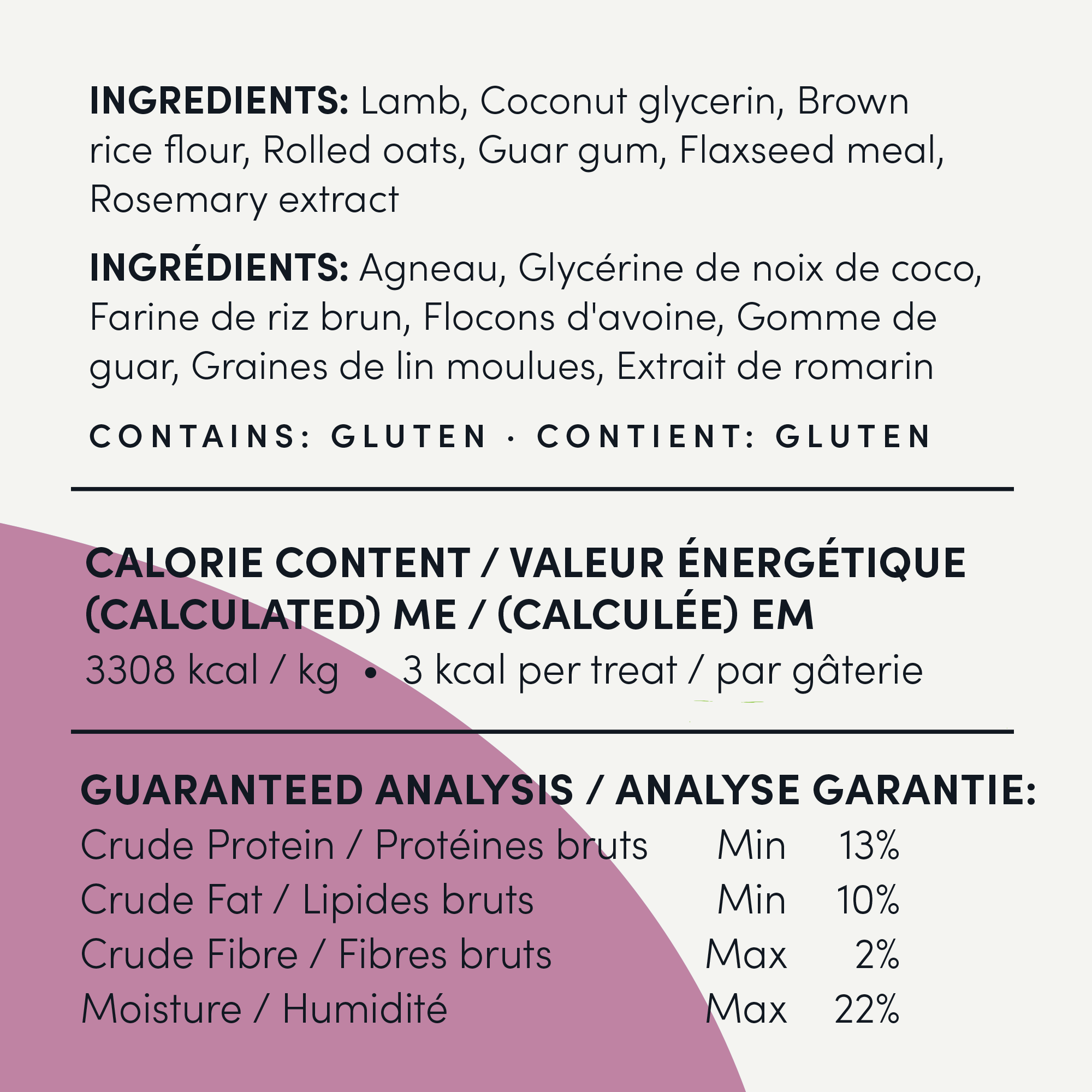 NEW! Each soft and chewy treat contains all natural ingredients starting with Lamb making it the perfect high protein snack for dogs of all ages and sizes. Lamb is an alternative protein ideal for dogs with specific allergies or food sensitivities.